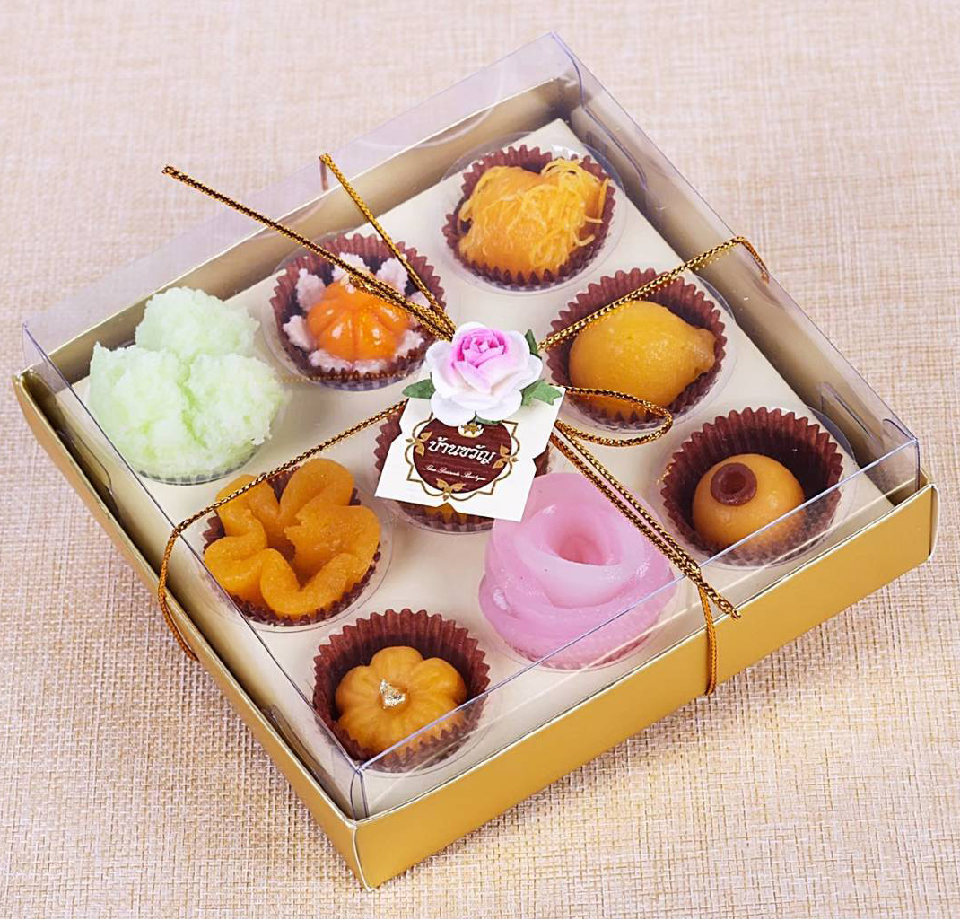 ทั้ง 9 ชนิด ได้เเก่ ขนมชั้น ขนมจ่ามงกุฎ เสน่ห์จันทร์ เอกทอง เม็ดขนุน ทองหยิบ ทองหยอด ฝอยทองและถ้วยฟูจัดด้วยความประณีตสวยงาม
