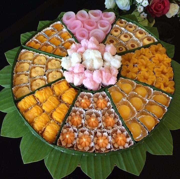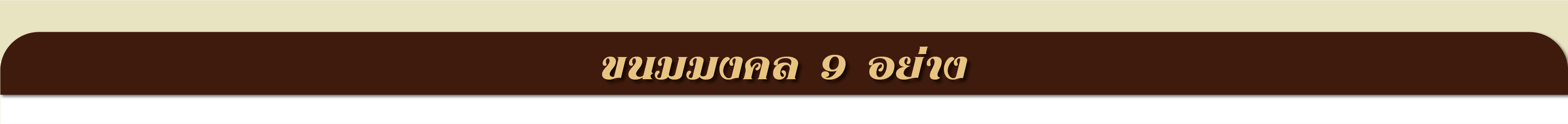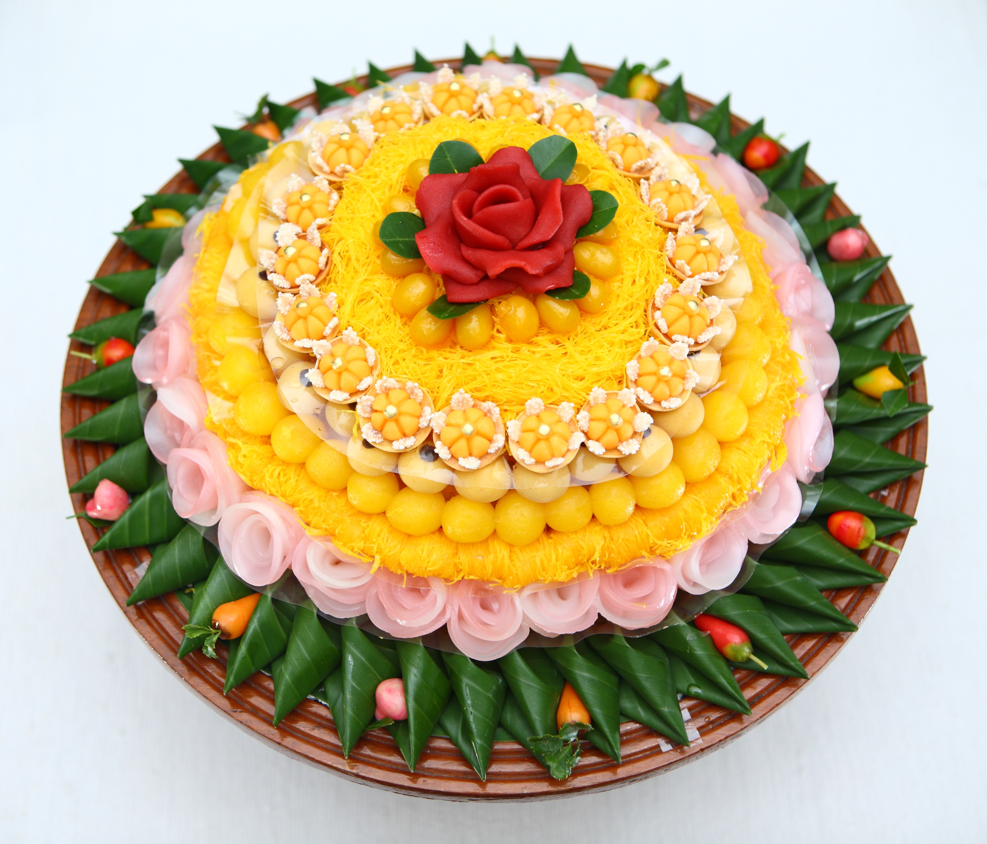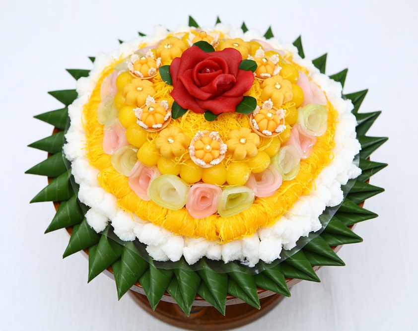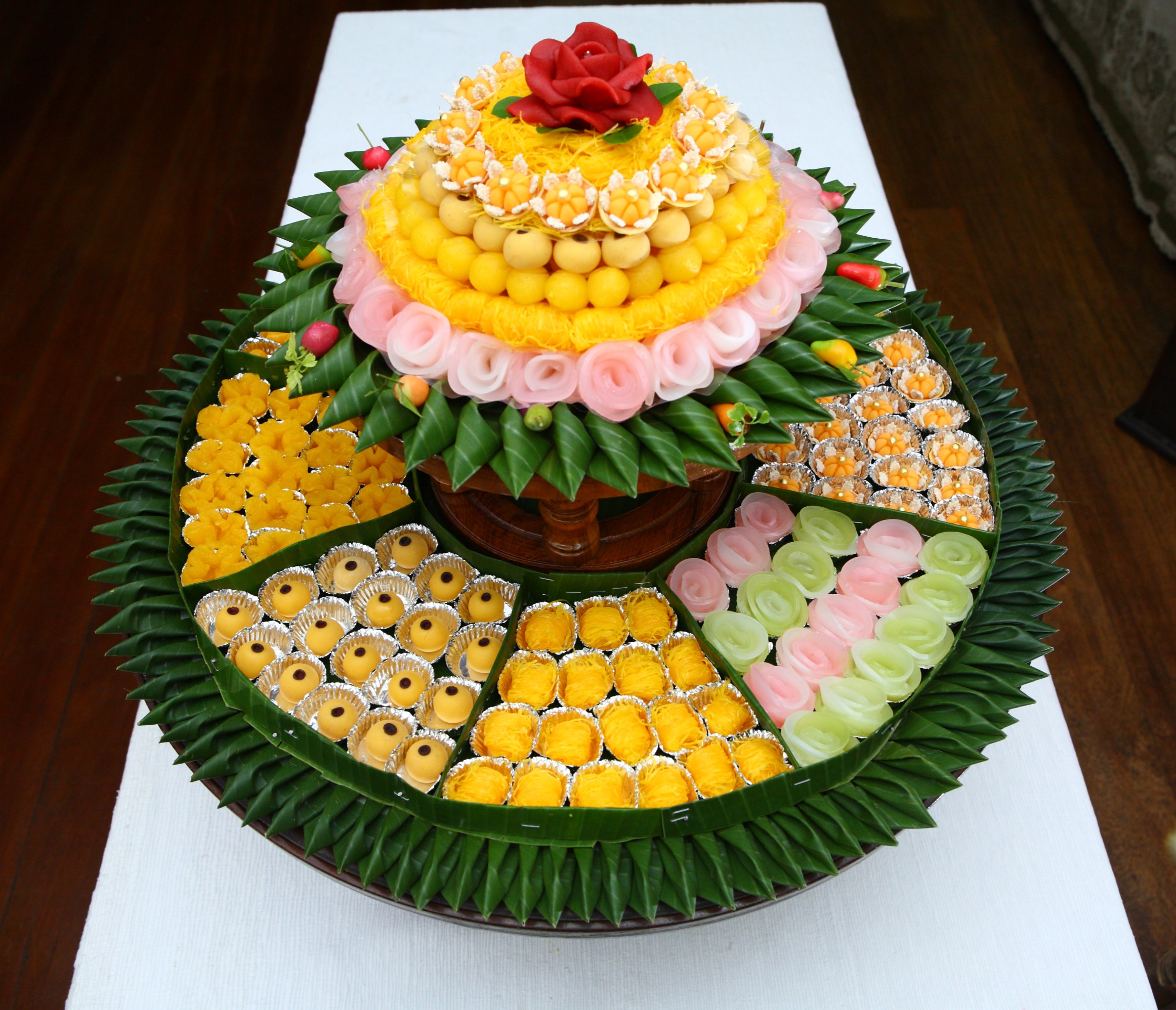 ทั้ง 9 ชนิด ได้เเก่ ขนมชั้น ขนมจ่ามงกุฎ เสน่ห์จันทร์ เอกทอง เม็ดขนุน ทองหยิบ ทองหยอด ฝอยทองและถ้วยฟูจัดด้วยความประณีตสวยงาม