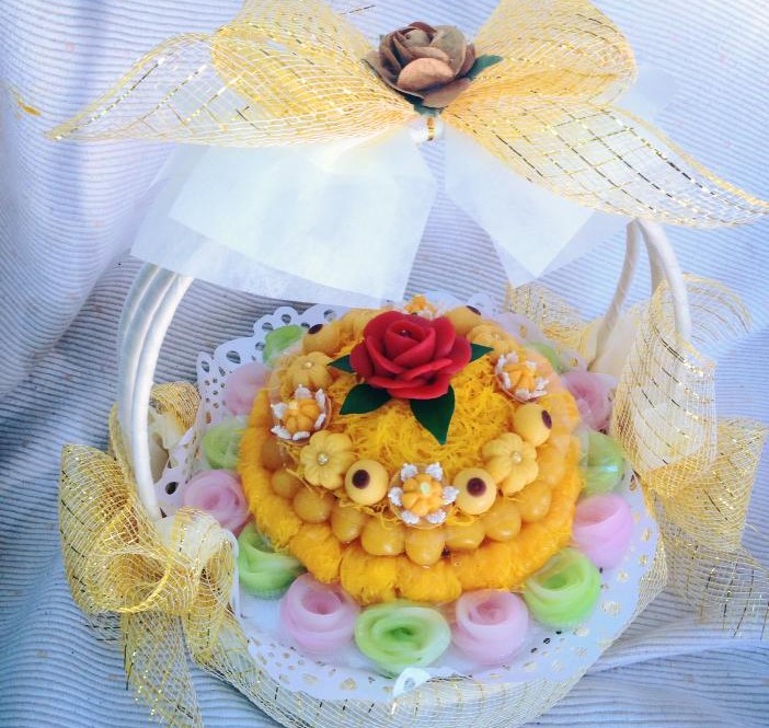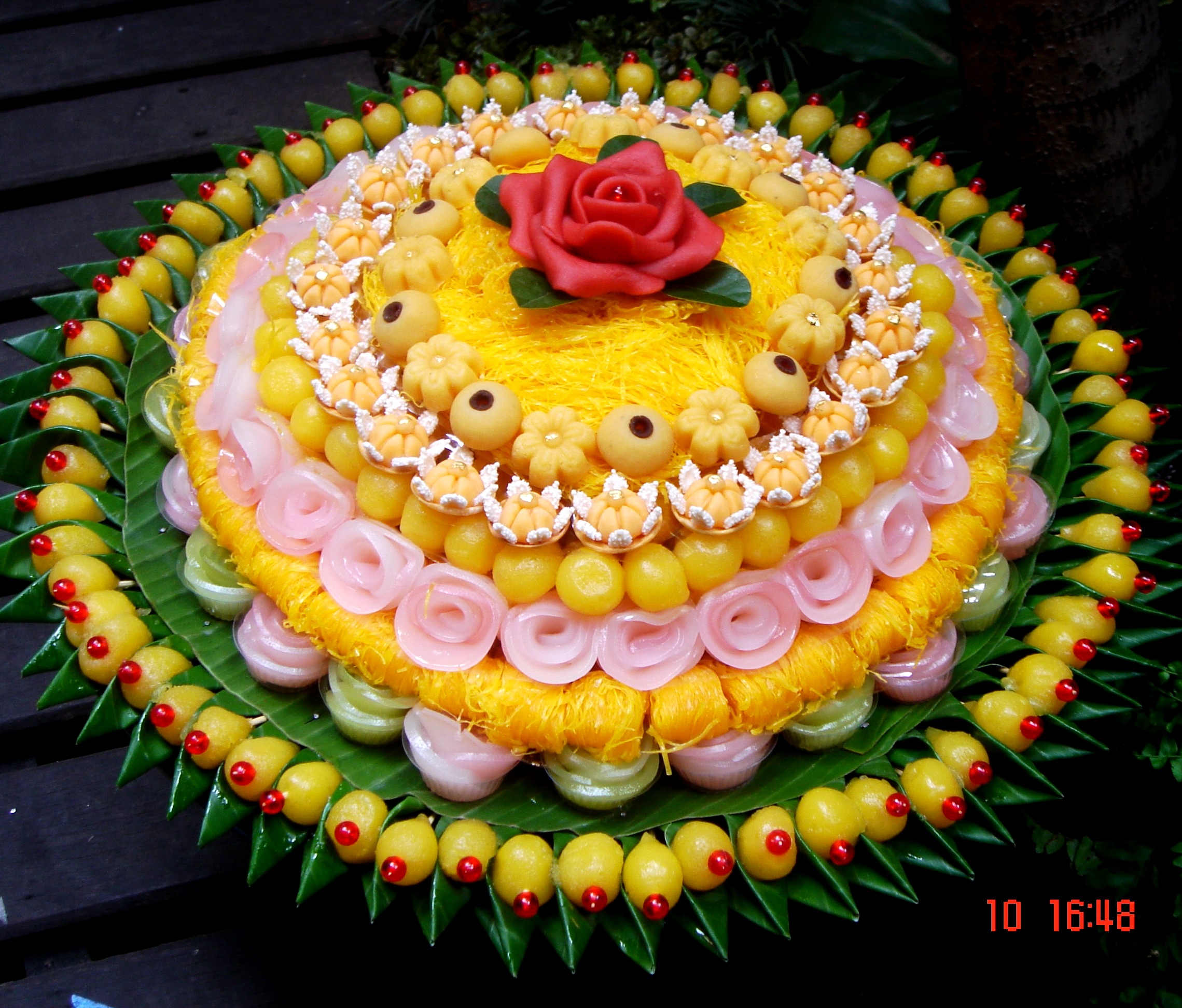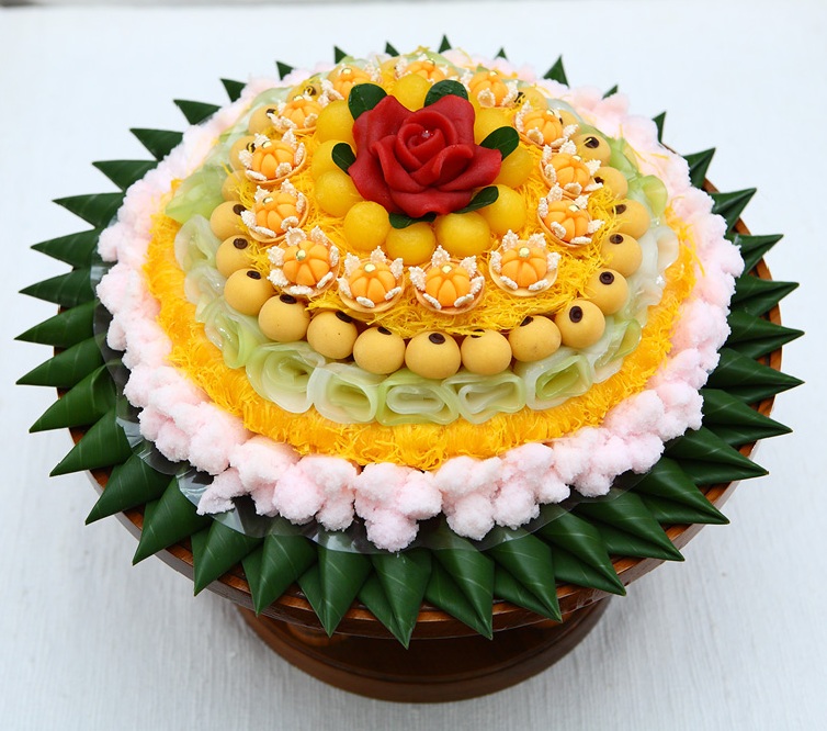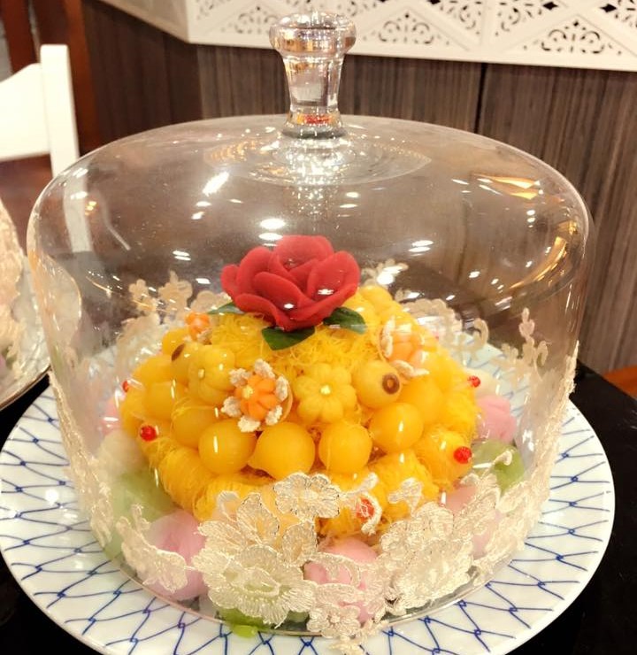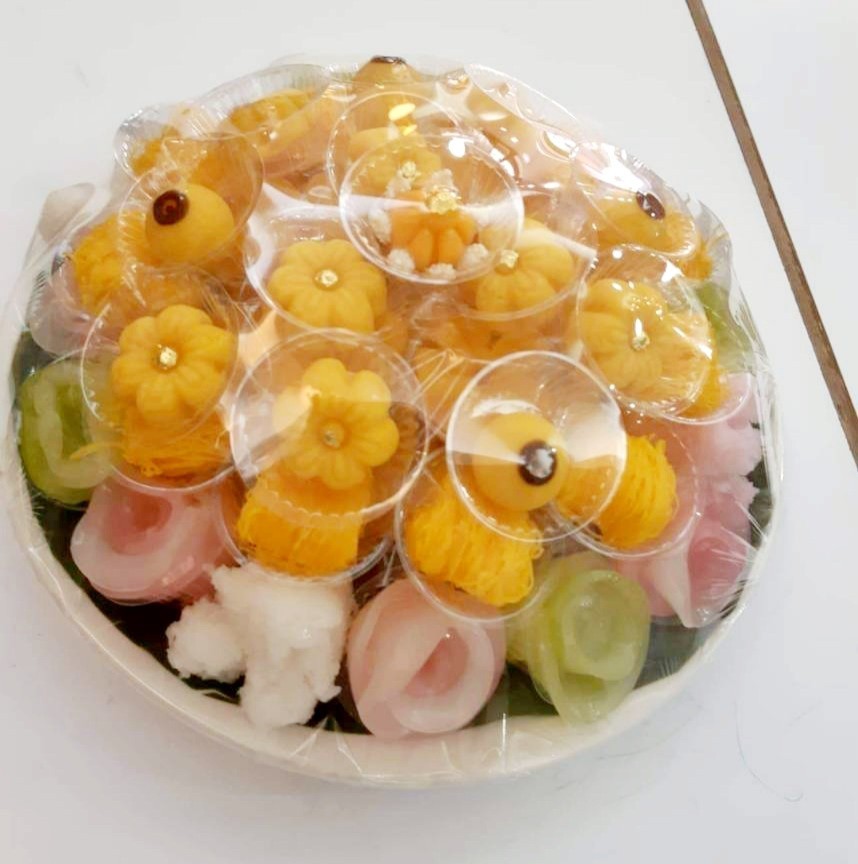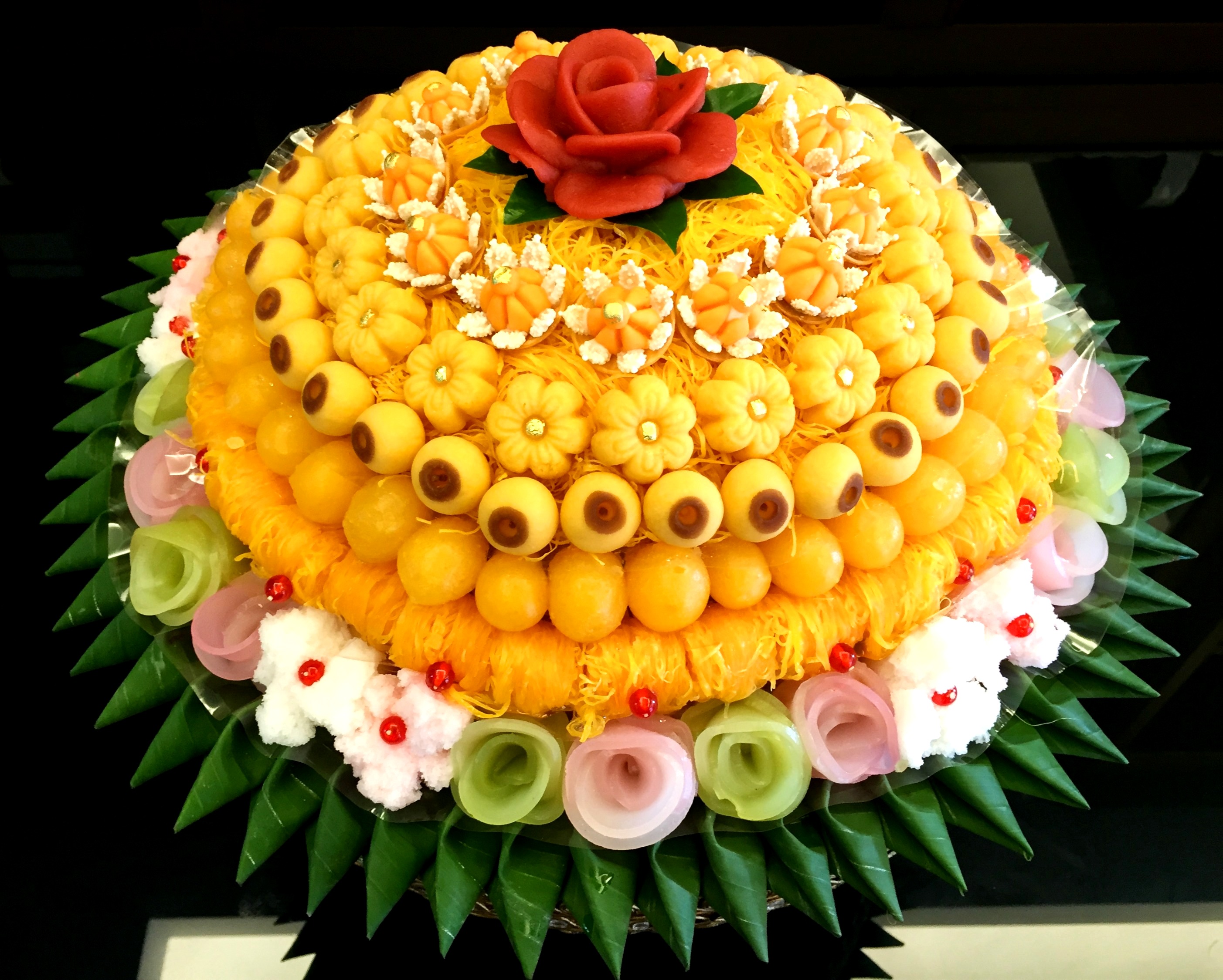 ทั้ง 9 ชนิด ได้เเก่ ขนมชั้น ขนมจ่ามงกุฎ เสน่ห์จันทร์ เอกทอง เม็ดขนุน ทองหยิบ ทองหยอด ฝอยทองและถ้วยฟูจัดด้วยความประณีตสวยงาม